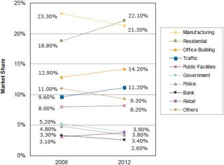 2007-2012年,住宅應用的市場份額預計將從18.8%升至22.1%。同期政府在安防方面的支出將會下降。但是,用于監控交通與零售店的視頻監視增長較快,將推動中國安防市場的增長。安防系統在制造業的滲透率較高,預計未來在該領域的增長將會放緩。