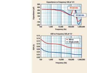 兩陽極鏡像設計的ESR性能稍遜色于三陽極縱向結構的效果,但它制造起來更便宜。鏡像設計的主要好處在于,它使多陽極電容器的高度減小,最低下降到3.1mm。