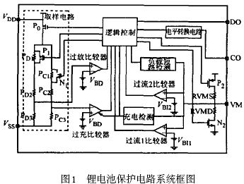 圖1 給出了鋰電池保護電路的系統框圖。圖中,VDD 和VSS 分別是電池電源和地輸入端; CO 和DO 分別是充電及放電控制端, 在正常工作模式下均為高電平, 電池既可以充電又可以放電, 反之, 充電和放電回路被切斷;VM 是放電過流、充電過流檢測端。電路實現的功能如下: