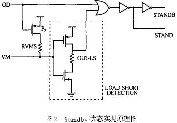 圖中信號OD 由數字電路產生, 當比較器檢測到電池電壓低于過放電檢測電壓, 并經過延時后,OD 將從高電平變為低電平, 此時通過P2 管將VM拉到高電平, 再經反相后從負載短路輸出OUT_L S端輸出低電平, 使輸出端STAND 變為低電平,STANDB 為高電平, 意味著系統可以進入Standby狀態; 一旦電池充電開始時,VM 端迅速被置為低電平, 此時不管OD 如何, 都通過OUT _LS 將STAND恢復為高電平, 系統進入正常的檢測狀態。