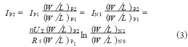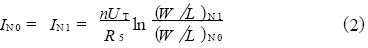 由圖3 可見, P0 和P1 組成電流鏡, 取相同的寬長比, 則。在P1、P0、N0、N1 和R5 構成的自偏置電路中, 選擇合適的R5 值, 可以使N0 和N1工作在亞閾值區。并且, 在時, 亞閾值MOS 管的漏電流Id 可表示為: