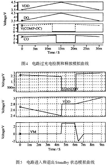 電路采用UMC 0. 6 μm 數字電路SPICE 模型進行HSPICE 模擬驗證。圖4 給出了電路對電池電壓VDD 進入和退出過充電狀態時的模擬結果, 從圖中可看出, 過充電出現后, CO 端被置為低電平, 反之則是與電源電壓相等的高電平。