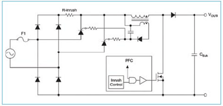 馬達電路首次通電時,電流首先流經橋接整流器、浪涌電阻,然后流至大容量電容器。在該電容器處,浪涌電阻對電流進行了限制。一段時間之后(時間長短通常取決于 PFC 控制器電路),電流開始流動。電流流動時,PFC 控制器開始開關功率 MOSFET,而 MOSFET 反過來啟動升壓電感中的脈沖電流。然后,這一脈沖電流會在輔助繞組上產生一個浮動非穩壓電壓,這一電壓用于觸發兩只 SCR 的柵極電路。兩只 SCR 以如下方式布置在電路中:提供一條電流通道,這條通道繞過橋接整流電路中的兩只整流器以及浪涌電阻。在電路中無需額外增加串聯元件的情況下,上述所選路徑即可為電流提供一條非常高效的通道。雖然 SCR 的正向壓降 (Vf) 比整流二極管稍大,但是固定阻值電阻或 NTC 等限流組件兩端的壓降已經消除。此外,SCR 散發的熱量可由散熱片予以消除(經由 SCR 的機架),而 NTC 無法做到這一點。這種散熱能力可使器件在更適宜的環境下運行,從而實現更高的系統穩定性和 MTBF 值。