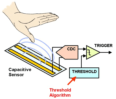 在許多情況下,接近傳感器在印制電路板包括兩個導體。中間媒介電介質的值非常小(接近1)。如果一個物體,例如手,移動到電容器的電子區域,它就改變電容。人體的組成超過90%水,因而電介質的值非常大(約50)。
