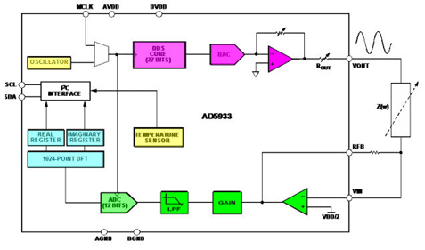這里,傳感器的反應通過快速的模數轉換器和快速的傅立葉分析記錄下來。采用DDS方法,初始的相位在任何時候都可精確地獲知。用同樣的方法,對其他頻率的反應也可以測量出來。阻抗的實部和虛部可以據此計算出,并且通過數字總線輸出。完全掃描僅需要幾百毫秒。此圖對該方法進行了說明。
