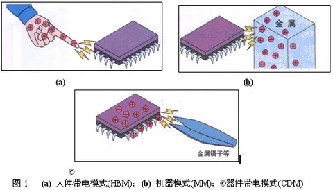器件的靜電破壞模式大致分為以下3種:人體帶電模式(HBM)、機(jī)器模式(MM)、器件帶電模式(CDM)。