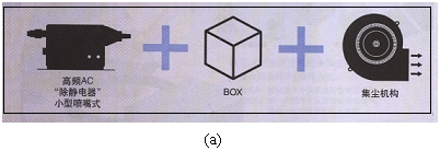 如Creceed除靜電盒產(chǎn)品具有3種功能:除靜電、除塵與集塵。其構(gòu)成由小型噴嘴式高頻AC“除靜電器”與BOX及集塵機(jī)構(gòu)組成,如圖3(a)所示。