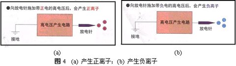 ⑵ 電暈放電是指:2個(gè)導(dǎo)體之間產(chǎn)生局部高電壓時(shí),因空氣絕緣遭到破壞而產(chǎn)生的伴有藍(lán)紫色輝光的放電現(xiàn)象。電暈放電式除靜電器會(huì)對(duì)放電針施加高電壓,從而引起電暈放電。由于電暈放電的緣故,放電針附近的空氣發(fā)生電離,產(chǎn)生帶電離子。圖4(a)所示為向放電針施加帶正電的高電壓后產(chǎn)生正離子過(guò)程。圖4(b)所示為向放電針施加帶負(fù)電的高電壓后,產(chǎn)生負(fù)離子過(guò)程。