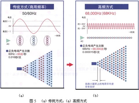 根據(jù)電壓施加方式的不同,電暈放電式除靜電器可以分為“AC方式”和“DC方式”2大類(lèi)。小金井的除靜電器采用了AC方式。其AC方式由1根放電針交互產(chǎn)生正離子和負(fù)離子。電離平衡良好,與DC方式相比,離子的產(chǎn)生量較少。而DC方式由正離子專(zhuān)用放電針和負(fù)離子專(zhuān)用放電針?lè)謩e產(chǎn)生帶電離子的方式。近距離的電離平衡較差,與AC方式相比,離子的產(chǎn)生量較多。