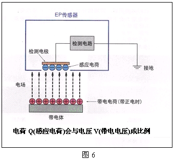 靜電電位傳感器“EP傳感器”主要利用了帶電物體和檢測(cè)電極之間的靜電感應(yīng)現(xiàn)象。帶電物體的電場(chǎng)會(huì)致使檢測(cè)電極表面產(chǎn)生感應(yīng)電荷。該感應(yīng)電荷會(huì)被換算成帶電物體的電位并顯示出來(lái)。其基本原理見(jiàn)圖6。電荷Q(感應(yīng)電荷)與電壓V(帶電電壓)成比例。
