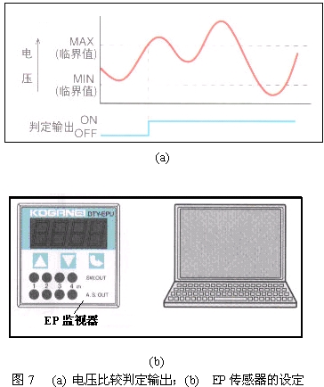 ⑷ 判定輸出功能。一旦超過(guò)設(shè)定電壓(臨界值),便會(huì)通過(guò)傳感器LED和電壓比較輸出(判定輸出)發(fā)出通知,如圖7(a)所示。