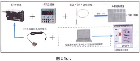 從圖8可知,通過(guò)電腦進(jìn)行設(shè)定的EP監(jiān)視器連接是由外部控制裝置與電腦及其組件構(gòu)成。而組件必需是EP傳感器1臺(tái)(如DTY-EPS型)與EP監(jiān)視器1臺(tái)(如DTY-EPU)及電源SW•通信電纜線(xiàn).及EP傳感器用通信電纜線(xiàn)。