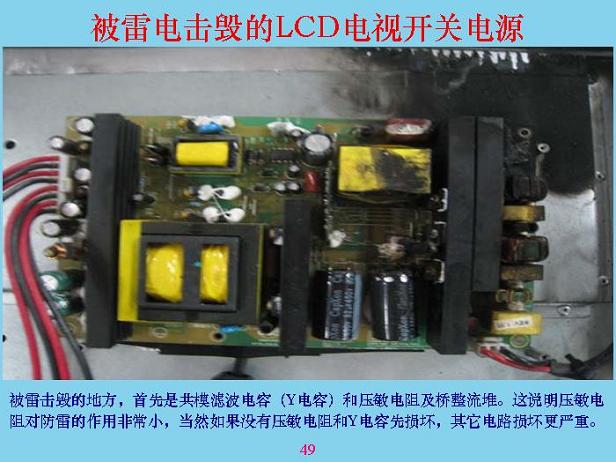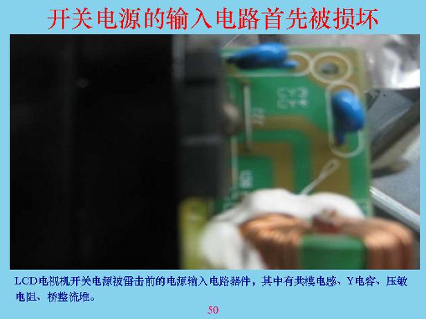 下面我們講一些具體的。這是一個開關(guān)電源,開關(guān)電源被雷劈的時候,輸入回路基本上都燒了,假如沒燒是什么樣的?可以看看,這是橋堆,這兩個是Y電容,這里面還有一個壓敏電阻。這是共模線圈,雷劈以后全部燒了,說明壓敏電阻沒有起到什么保護(hù)作用,兩個電容都燒了,說明電感相當(dāng)、相當(dāng)?shù)馗摺榱朔乐估纂姡紫惹懊嬉欢ㄒ右粋€能量吸收,比較大的東西,成本相對來說比較低,像試驗(yàn)站里面的放電裝置,那個東西沒有地方裝,也貴得很。在硬紙板上面排幾個鋸齒,中間隔一個頭就行了。如果中間隔6mm也可以。有一個一級電感,電感可以使瞬間上去很快的電壓降下來,突然加一個1萬伏、10萬伏,加上去只有這兩端,另外兩端建立不起來,所以剛加進(jìn)去的時候?qū)纂妬碚f,大部分能量都被吸收掉了。后面經(jīng)過這個以后,剩余部分通過共膜電容繼續(xù)吸收,吸收完以后還有差模部分,產(chǎn)生的差模部分通過電容把差模吸收掉。共模電容和差模電容具有抑制傳導(dǎo)干擾的作用,對雷電也有抑制作用,所以很多人也在問,電容接到前面好還是接在后面好?這個東西看你有什么作用,如果只是為了防EMI電磁干擾的話,接在越前面越好,接在測試儀表的輸入端最好,接到那里把信號全部短路掉了,就看不到了。但是對于雷電,你接到后面要好很多,所以這主要是防雷的,你就不要考慮電磁干擾和EMC了,盡量把兩個放在后面。