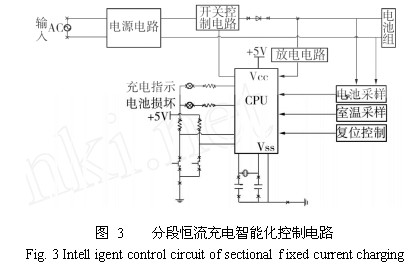 分段恒 流 充 電 智 能 化 控 制 電 路 如 圖3 所示。該電路采用 CPU 控制 ,可對充電電池和充電環(huán)境溫度進(jìn)行檢測 ,對電池充電進(jìn)行計(jì)時(shí) ,采樣充電過程中電池的電壓和電流 ,對分段恒流充