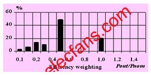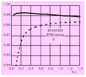 對(duì)于傳統(tǒng)電力電子裝置的設(shè)計(jì),我們通常是通過(guò)每千瓦多少錢(qián)來(lái)衡量其性價(jià)比的。但是對(duì)于光伏逆變器的設(shè)計(jì)而言,對(duì)最大功率的追求僅僅是處于第二位的,歐洲效率的最大化才是最重要的。因?yàn)閷?duì)于光伏逆變器而言,不僅最大輸出功率的增加可以轉(zhuǎn)化為經(jīng)濟(jì)效益,歐洲效率的提高同樣可以,而且更加明顯。歐洲效率的定義不同于我們通常所說(shuō)的平均效率或者最高效率。它充分考慮了太陽(yáng)光強(qiáng)度的變化,更加準(zhǔn)確地描述了光伏逆變器的性能。歐洲效率是由不同負(fù)載情況下的效率按照不同比重累加得到的,其中半載的效率占其最大組成部分(見(jiàn)圖1)。