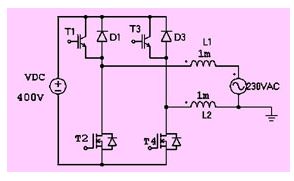 由于上橋臂的igbt工作在50hz的開(kāi)關(guān)頻率下,實(shí)際上并不需要對(duì)該支路進(jìn)行濾波。因此對(duì)電路拓?fù)溥M(jìn)行優(yōu)化,可以得到圖14所示的發(fā)射極開(kāi)路型拓?fù)洹_@種拓?fù)涞膬?yōu)點(diǎn)是只有有高頻電流經(jīng)過(guò)的支路才有濾波電感,從而減小了輸出濾波電路的損耗。