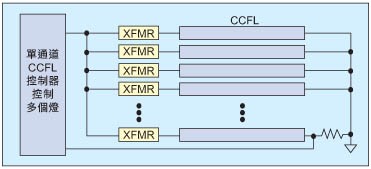CCFL已在筆記型電腦、數位相機、導航系統以及其他具有較小LCD螢幕的設備中使用多年。這些類型的設備通常只用一個CCFL,因此,傳統設計只用一個CCFL控制器。隨著大尺寸LCD面板的出現,帶來對多CCFL的需求,有必要采用新的方式來應對這種新的需求。可能的方式之一是采用一個單通道CCFL控制器來驅動多個燈(圖5)。這種方式中,CCFL控制器只透過其中的一個燈來監測燈電流,而以幾乎相同的交流波形同時驅動所有并聯的燈。然而,這種方式存在著幾個缺陷。