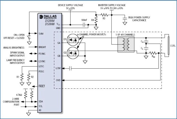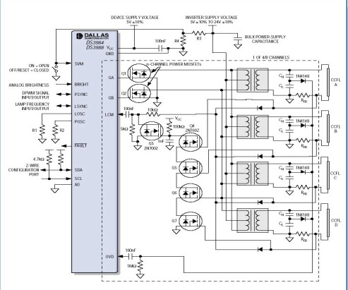 DS3984/DS3988采用推挽驅動架構,可以使用更低成本、更高效率的n通道MOSFET。轉換器直流電源電壓也可采用更高的電壓。單獨的燈控制和監測可提供均勻的亮度,并減少轉換器的元件總數。采用單獨的燈控制時,如果某一個燈失效,僅會使這個失效的燈停止工作,其他燈繼續工作,并不會受影響。片上振蕩器產生的燈頻和脈沖調光頻率被嚴格限定在±5%水準,消除了對於顯示影像的影響,并且也可被同步至外部時脈源。