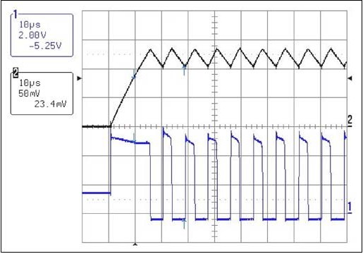 如圖7所示,Q1是降壓型充電器的開關(guān)功率晶體管;L1是濾波電感;D1是續(xù)流或整流二極管。輸入電容C1為10uF、超低ESR的陶瓷濾波電容。用鉭電容或者其它電解電容替代C1會使充電器的性能降低。R7是電流調(diào)節(jié)器檢測放大器的檢流電阻。DS2712的基準電壓為0.125V,并具有24mV滯回。通過CSOUT提供閉環(huán)、開關(guān)模式電流控制。充電控制引腳CC1將Q2的柵極拉低時,使能Q1的柵極驅(qū)動。Q1和Q2均為低Vt (柵-源門限電壓)的pMOSFET。CC1和CSOUT均為低電平時,Q2的漏-源電壓將稍大于Vt。該電壓以及CSOUT的正向壓降構(gòu)成了Q1的柵極開關(guān)電壓。CC1為低電平時,啟動電流閉環(huán)控制。圖8所示為啟動開關(guān)時的波形。上方波形是0.125Ω (檢流電阻兩端的電壓,下方波形是Q1漏極至GND的電壓。開始時,當Q1打開(CC1和CSOUT均為低電平)時,電感電流向上爬升。當電流增大到使檢流電阻兩端的電壓達到0.125V時,CSOUT變?yōu)楦唠娖剑_關(guān)關(guān)斷。此后,電感電流開始下降,直到檢流電阻兩端的電壓達到約0.1V,CSOUT又變?yōu)榈碗娖健V灰狢C1為低電平,該過程將一直持續(xù)。