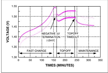 通常采用恒流源對NiMH電池充電。當達到充滿狀態(tài)時,會發(fā)生放熱化學反應,并導致電池溫度上升,電池端電壓降低。可檢測電池溫度上升速率或者負向電壓變化率,并用來終止充電。這些充電終止方法分別稱為dT/dt和-ΔV。充電速率非常低時,dT/dt和-ΔV不太明顯,很難精確檢測到。電池開始進入過充狀態(tài)時,dT/dt和-ΔV響應開始顯現(xiàn)。此時如果繼續(xù)充電,將損壞電池。