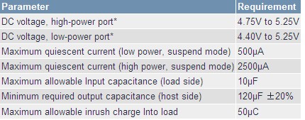 在符合USB 2.0規(guī)范的主機中,大功率端口的上游端具有120uF、低ESR電容。所連接的USB設備的輸入電容限制在10?F以內(nèi),在最初的負載連接階段,允許負載從主機(或自供電集線器)吸取的最大電荷數(shù)為50?C。這樣一來,當新設備連接至USB端口時,上游端口的瞬態(tài)電壓跌落小于0.5V。如果負載正常工作時需要更大的輸入電容,則必須提供浪涌電流限制器,以保證對更大的電容充電時電流不會超過100mA。