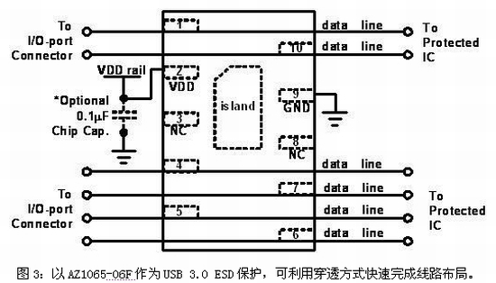 AZ1065系列產(chǎn)品提供了六個極低電容的引腳,可同時保護USB 3.0的兩組差動對(TX和RX)及USB 2.0的差動對(D+和D-),具有減小PCB面積和降低布局復雜度等優(yōu)點,并可大幅節(jié)省系統(tǒng)成本。更特別的是,AZ1065-06F率先采用交錯型的引腳,以便PCB布局時可利用穿透式(Feedthrough)方式實現(xiàn)完美設(shè)計,圖3顯示了AZ1065-06F的接線方式。
