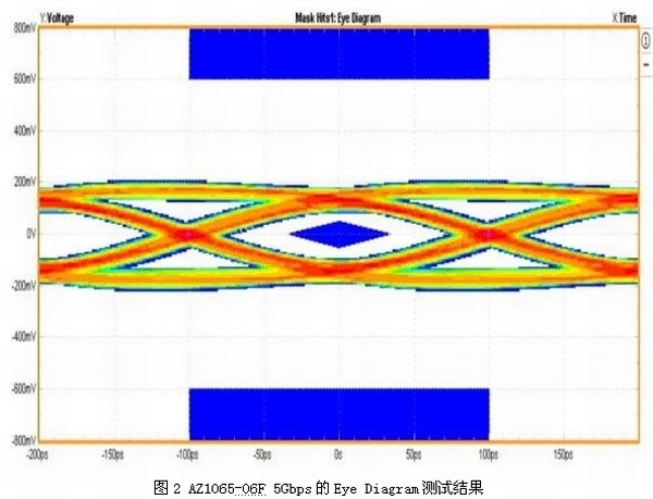 在IEC 61000-4-2接觸模式6kV(TLP電流等效約為17A)的ESD攻擊下,箝制電壓僅有13.4V,足以有效避免系統(tǒng)產(chǎn)品在靜電測試時發(fā)生數(shù)據(jù)錯誤、當機甚至損壞的情況。圖2所示為裝有ESD保護組件AZ1065-06F的USB 3.0端口順利通過5Gbps的眼圖測試結(jié)果。