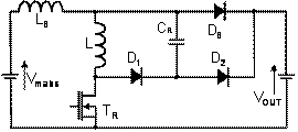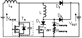 從理論上講,因為所有的開關損耗都被消除,零壓轉換(ZVT)是功率因數校正(PFC)應用最理想的拓撲。此外,不管輸入和輸出功率如何變化,這種電路都能正常工作。然而,在實際應用中,升壓二極管DB的反向恢復電流對零壓轉換電路的影響非常明顯,致使電感和最小占空比都受到一定程度的限制。因為小線圈L上的重置電流,D2 的反向恢復電流包含高應力電壓和寄生阻尼振蕩。最后,PN二極管的動態特性影響零壓轉換(ZVT)電路的總體能效,因為這個晶體管的導通時間應該增加,而且為降低半導體器件遭受的電應力,必須增加一個有損緩沖器。