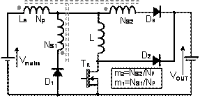 這個創新的電路是按照軟開關標準設計的,如圖4所示,為恢復小線圈L貯存的電能,在升壓線圈LB 附近新增兩個二極管 D1和D2 和兩個輔助線圈NS1和NS2 。