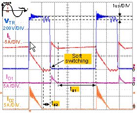 在t3時,功率晶體管關斷。這時,COSS電容電壓被小線圈L內貯存的電流線性充電,直到二極管D2導通為止;在關斷期間,功率開關上沒有過壓應力。[page]