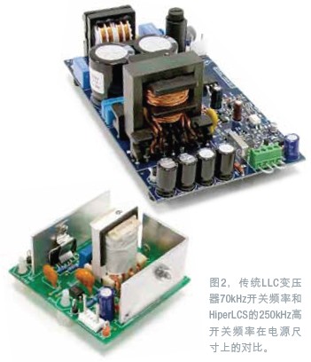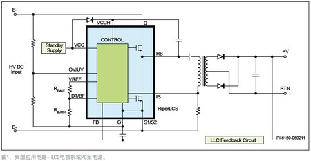 在高壓電源轉(zhuǎn)換電路設計中,諸如電源噪聲、開關頻率、開關損耗、電源體積、可靠性等問題一直是關鍵所在。與其它的高壓拓撲結(jié)構相比,LLC轉(zhuǎn)換器因效率高且設計的電源體積小,在高壓電源適用領域一直受到設計師的青睞,不過其設計難度也非常大。Power Integrations公司(PI)不久推出的HiperLCS系列LCS700-708高壓LLC電源IC,將變頻控制器、高壓端和低壓端驅(qū)動器以及兩個MOSFET同時集成到了一個低成本封裝中,具有出色的設計靈活性,其最高負載效率超過97%,并利用高頻開關來減小變壓器的尺寸和輸出電容的占板面積,由此達到縮小電源尺寸的目的。圖1所示為HiperLCS功率級的電路簡圖,其中LLC諧振電感集成在變壓器中。變頻控制器通過零電壓(ZVS)開關功率MOSFET,消除開關損耗,從而達到高效率。