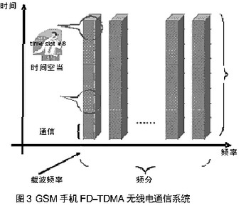 GSM(全球通)手機標準使用頻分多路傳輸和時分多路傳輸,同時傳送大量電話,如圖3所示。