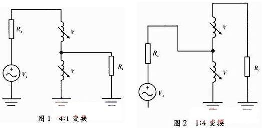 變壓器:主要實現(xiàn)低頻段,隨著工作頻段的升高,這類電路的應(yīng)用越來越少。傳輸線變壓器可以實現(xiàn)寬帶阻抗變換,實現(xiàn)4:1和1:4工作模式如圖1和圖2所示。可以實現(xiàn)平衡和非平衡的變換,尤其在電視機外接天線到同軸線輸入端口的連接中得到應(yīng)用。