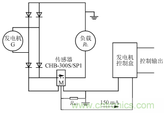 在某型地面車輛上裝備了一套獨立的大功率發電系統,該發電系統設計選用了CHB-300S型閉環霍爾電流傳感器作為系統電流檢測部件,通過對傳感器的輸出信號進行處理,設定限流工作點,確保發電系統的輸出功率不高于發電機的額定功率。閉環霍爾電流傳感器CHB-300S的應用,很好地實現了上述應用目的。如圖3所示,發電機G輸出正端匯流母線穿過CHB-300S/SP1的原邊電流穿孔,由傳感器CHB-300S/SP1檢測發電機的輸出電流,傳感器的輸出IM與發電機控制盒相連,由發電機控制盒設定發電機的輸出電流控制點,依據此信號,對發電機的輸出電流加以限制,避免發電機因輸出功率過高而發生故障或損壞,從而保證發電系統正常工作。