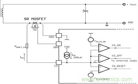 CS_OFF比較器是非常精密的真正的零比較器,通過同步整流將系統(tǒng)能效提升至最高。NCP4305的CS腳和SR MOSFET(M1) 之間的電阻用來調(diào)節(jié)關(guān)斷電流。當(dāng)CS腳電壓低于VTH_CS _ON閾值時,M1 導(dǎo)通;當(dāng)CS腳電壓高于VTH_CS _OFF閾值時,M1關(guān)斷。