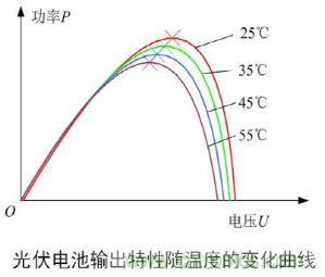 在一定的光照強(qiáng)度和環(huán)境溫度下,光伏電池可以工作在不同的輸出電壓,但是只有在某一輸出電壓值時(shí),光伏電池的輸出功率才能達(dá)到最大值,這時(shí)光伏電池的工作點(diǎn)就達(dá)到了輸出功率電壓曲線的最高點(diǎn),稱之為最大功率點(diǎn)。如圖2所示為MPPT受光照影響圖、圖 3所示為MPPT受溫度影響圖