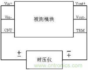 作為模塊電源的重要指標,標準中也規定了隔離耐壓相關測試方法,簡單的測試時一般采用等電位連接測試,連接示意圖如下: