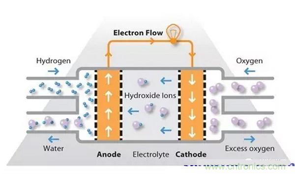 氫燃料在陽極處被處理,其中電子與鉑基催化劑的表面上的質子分離。質子通過膜到達電池的陰極側,同時電子在外部電路中行進,產生電池的電輸出。在陰極側,另一個貴金屬電極將質子和電子與氧氣結合以產生水,其作為唯一的廢物排出;氧可以以純化形式提供,或者在電極處直接從空氣中提取。
