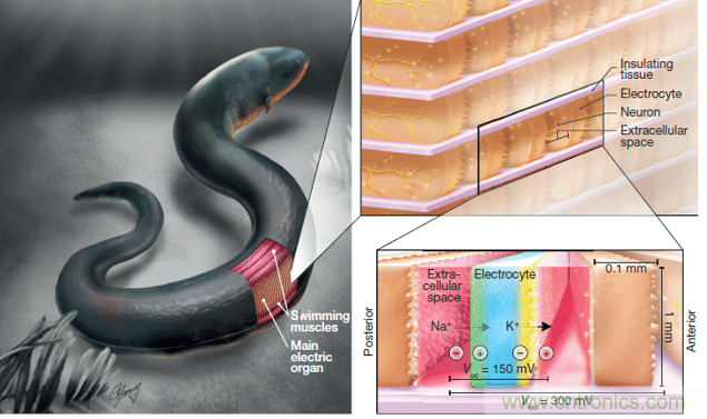 電鰻是一種淡水魚類,能通過特化的肌肉組織放電。它們的體長可達兩米,而放電器官的長度就可達體長的80%。在放電器官中有數(shù)以千計的特化肌肉細胞,稱為“放電體”(electrocyte)。每個放電體只能產(chǎn)生很小的電壓,但數(shù)千個放電體合在一起,就能產(chǎn)生高達600伏的電壓,足以擊倒一個人,甚至一匹馬。電鰻的放電機制為伏打提供了發(fā)明電池的靈感,使他稱為一位19世紀的名人。