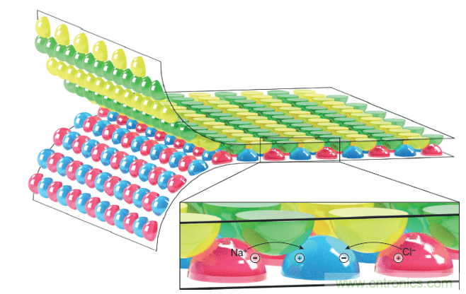 紅色凝膠含有鹽水,而藍色凝膠含有淡水。離子原本會從紅色凝膠流向藍色凝膠,但由于基板的間隔,無法出現(xiàn)這樣的流動。與此同時,與這塊基板對應(yīng)的另一塊基板上布置了綠色和黃色凝膠,當它們橋接在藍色和紅色凝膠之間的空隙時,就能為離子運動提供通道。