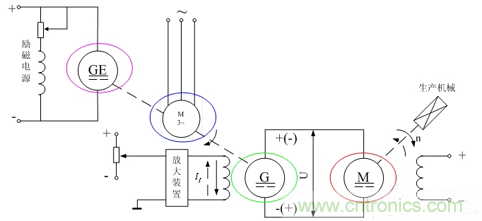 圖中,交流電動機(圖1中的藍色圈顯現)為原動機,工作時轉速基本恒定。由它拖動的直流發(fā)電機G(圖-1中的綠色圈顯現秒)給需要調速的直流電動機M(圖1中的紅色圈顯現)的電樞供電。GE(圖1中的紫色圈顯現)為一臺小型直流發(fā)電機,可以如圖那樣與交流電動機、直流發(fā)電機G同軸相連,也可另設一臺小型交流電動機對其拖動。它在系統中的作用是提供一小容量的直流電源,供直流發(fā)電機G(圖1中的綠色圈顯現)和直流電動機M(圖1中的紅色圈顯現)的定子勵磁用,所以又稱GE為勵磁發(fā)電機。