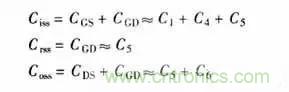 (3)C2+C4代表從柵極到源極P區間的電容。C2是電介質電容,共值是固定的。而C4是由源極到漏極的耗盡區的大小決定,并隨柵極電壓的大小而改變。當柵極電壓從0升到開啟電壓UGS(th)時,C4使整個柵源電容增加10%~15%。