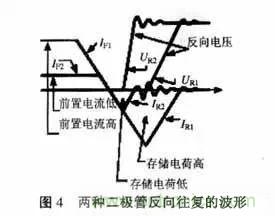 圖4是存儲電荷高或低的兩種二極管電流、電壓波形。從圖中可以看出存儲電荷少時,反向電壓的斜率大,并且會產生有害的振動。而前置電流低則存儲電荷少,即在空載或輕載時是最壞條件。所以進行優化驅動電路設計時應著重考慮前置電流低的情況,即空載或輕載的情況,應使這時二極管產生的振動在可接受范圍內。