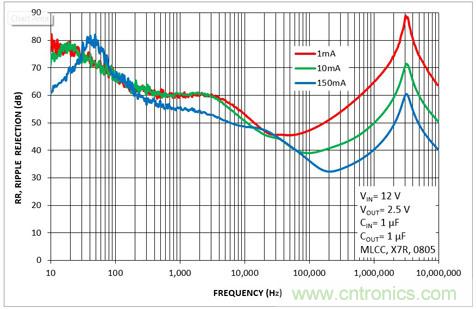 b)輸入電壓的快速變化(通常是由DC-DC轉換器的輸出電壓紋波引起的)無法通過控制回路完全過濾,于是輸入電壓的變化會一定程度地反映在輸出電壓中,該參數稱為電源抑制比(PSRR),且通常是頻變參數。一些制造商標示的PSRR為負數,有些則為正數。一般而言,PSRR絕對值越高,從輸入到輸出的傳輸干擾信號就越少。通常情況下,受到干擾的輸入電壓會以mV或更低的單位級別傳輸至輸出端。相似地,輸入電壓的快速變化(即“線路瞬態響應”)可發生于LDO輸出端。