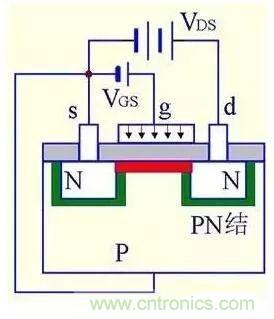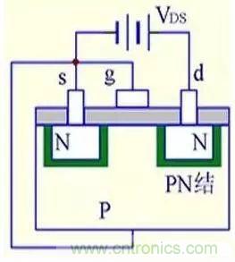 (1) VGS=0時,不管VDS極性如何,其中總有一個PN結(jié)反偏,所以不存在導電溝道。