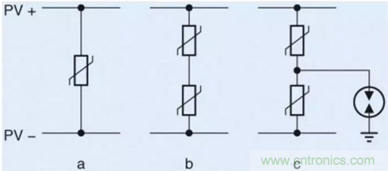 額定電壓為1000 V DC的金屬氧化物壓敏電阻通常用于太陽能逆變器的直流輸入。根據(jù)待處理線路電壓,例如電壓為300 VRMS的壓敏電阻可以是變頻器輸出的首選。在這兩種情況下,也可使用充氣式氣體放電管以實現(xiàn)額外防護(hù)。圖2為太陽能逆變器直流輸入的常用電路設(shè)計:最簡化版本(圖2a)僅使用一個額定電壓為1000 VRMS的壓敏電阻(例如片狀,直徑20毫米)。在這種情況下,額定直流電壓為1414 V DC,而鉗位電壓在100 A時為2970 V。圖2b所示電路通過串聯(lián)的兩個壓敏電阻運作,兩元件應(yīng)專用于550 VRMS (745 V DC),以提供相同保護(hù)。這一設(shè)計提供了一大優(yōu)點:鉗位電壓在電流為100 A時僅為2710 V,從而進(jìn)一步抑制過電壓。此外,待吸收能量將平均分布于兩個組件,從而降低負(fù)荷系數(shù)。圖2c所示電路則在壓敏電阻與地面之間添加了一個氣體放電管。這一設(shè)計仍將提供充分保護(hù),特別是當(dāng)單個或兩個壓敏電阻出現(xiàn)故障或因負(fù)荷導(dǎo)致老化時。必須使用氣體放電管,以免當(dāng)兩個壓敏電阻同時故障時進(jìn)入持續(xù)導(dǎo)電狀態(tài)。