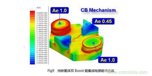圖9為該電感在上述條件下,讓左邊線圈電流最大,使磁芯接近飽和的仿真結果。從圖中可以明顯看出,即便兩邊的磁芯接近飽和,中間公共部分磁芯的截面雖小,卻仍遠離飽和。此時磁芯即便是處于高頻工作狀態(tài),中間磁芯柱上的ΔB非常小,這部分磁芯的損耗自然也很低。