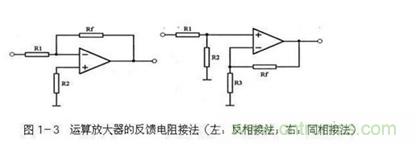 其次,由于放大倍數為無窮大,所以不能將運算放大器直接用來做放大器用,必須要將輸出的信號反饋到反相輸入端(稱為負反饋)來降低它的放大倍數。如圖1-3中左圖所示,R1的作用就是將輸出的信號返回到運算放大器的反相輸入端,由于反相輸入端與輸出的電壓是相反的,所以會減小電路的放大倍數,是一個負反饋電路,電阻Rf也叫做負反饋電阻。