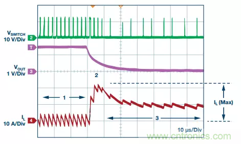 最初,峰值電感電流由選定的電感值、電源開關導通時間、電路的輸入和輸出電壓以及負載電流設置(圖中用“1”表示)。當電路短路時,電感電流迅速上升,直至達到限流點,即 RS × IINDUCTOR (IL)等于最大電流檢測電壓,以保護器件和下游電路(圖中用“2”表示)。然后,內置電流折返限制(圖中數字“3”)進一步降低電感電流,以將熱應力降至最低。