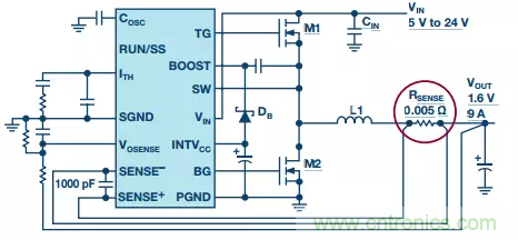 使用RSENSE和DCR兩種檢測方法時,由于檢測信號較小,故均需要開爾文檢測。必須讓開爾文檢測痕跡(圖5中的SENSE+和 SENSE-)遠離高噪聲覆銅區和其他信號痕跡,以將噪聲提取降至最低,這點很重要。某些器件(如LTC3855)具有溫度補償DCR檢測功能,可提高整個溫度范圍內的精度。
